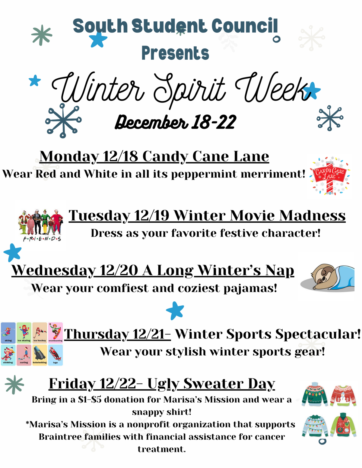 (1.) Next week, in the lead-up to the Winter Break, South's Student Council is organizing a Spirit Week. We can't wait to see everyone's festive & fun attire!