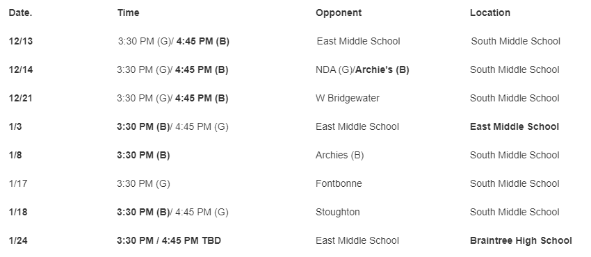 (2.) Our first South basketball games will be held tomorrow, Wednesday 12/13, at South. The girls will play East at 3:30pm and the boys will play East immediately after, around 4:45pm. Come cheer the Bulldogs on to victory against their crosstown rivals!