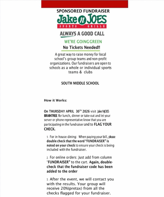 - South PTO is holding a dine-out fundraiser to support the PTO mission at Jake N Joe's this Thursday, 4/30.