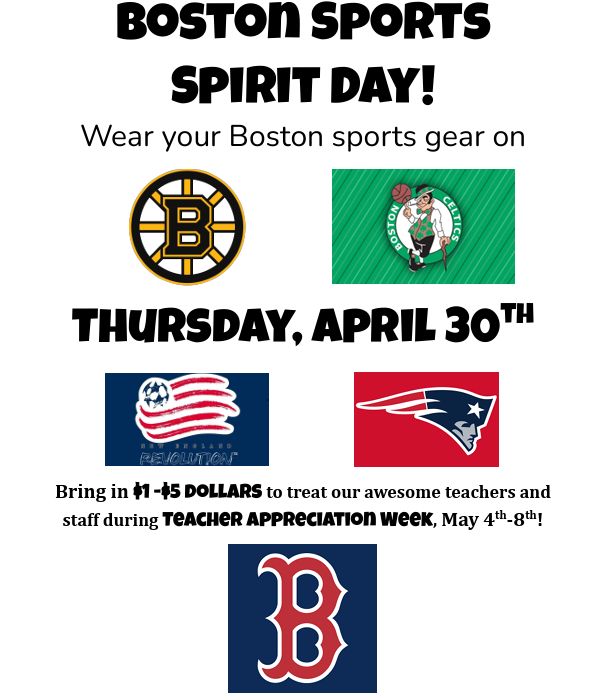 - Student Council is holding a Boston Sports Spirit Day to raise money for students to show their staff appreciation next week during Teacher Appreciation Week!